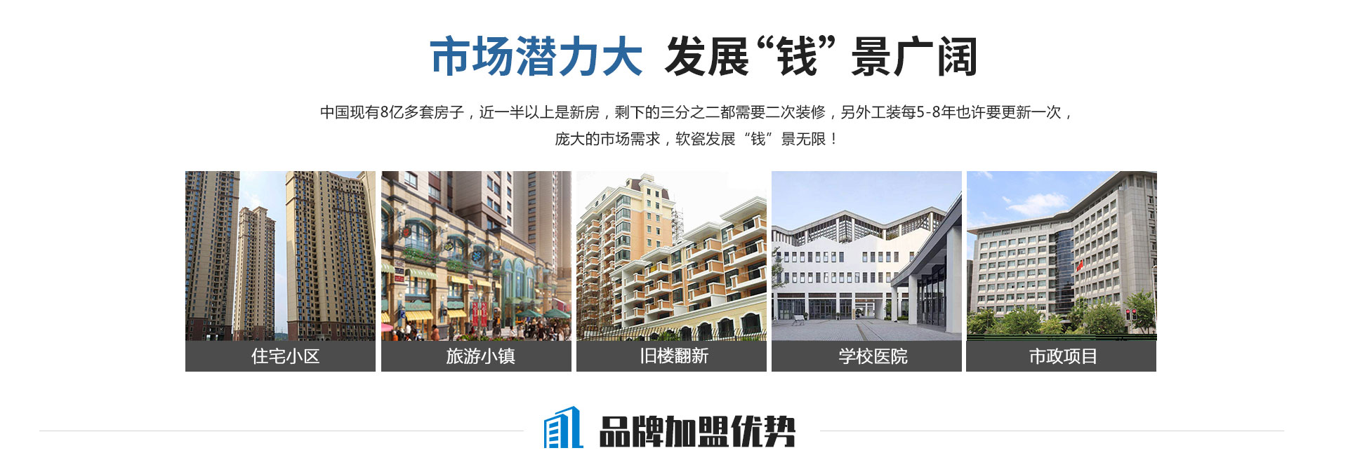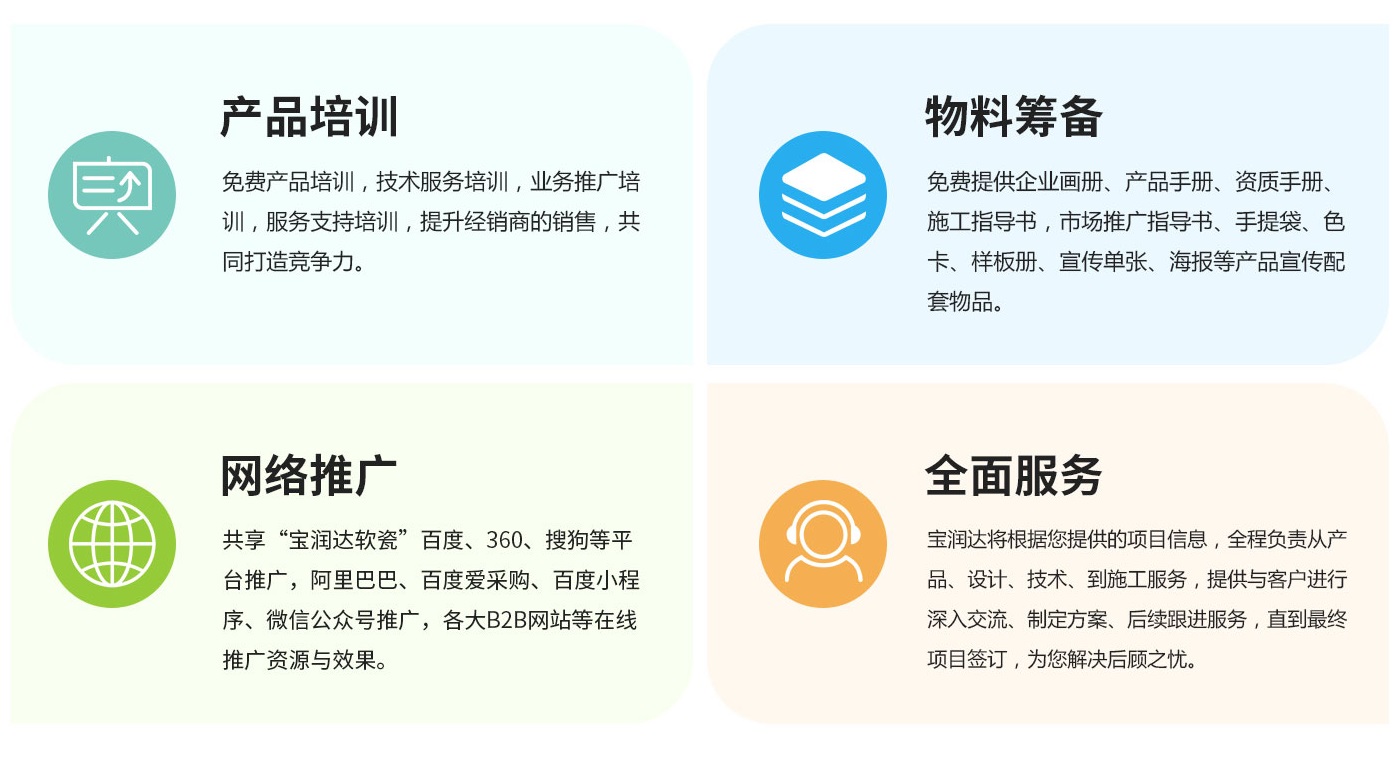 2、完備的服務(wù)系統(tǒng):系統(tǒng)的售前、售中、售后服務(wù),專業(yè)的軟瓷營(yíng)銷策略及施工技術(shù)